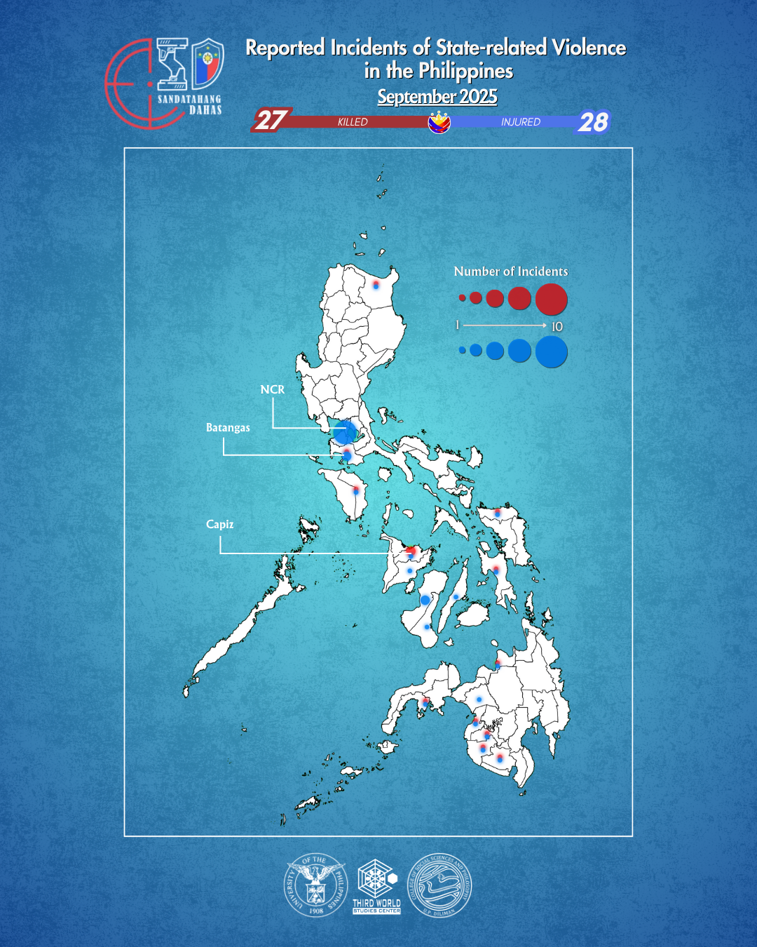The Sandatahang Dahas (Armed Violence) Project is a monthly monitor by the UP Third World Studies Center on reported state-related violence. Specifically, this pertains to killings and injuries caused by and inflicted on duly-designated gun-bearing members of law enforcement organizations or a public security agent in the Philippines.